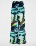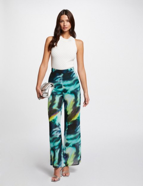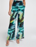 Szerokie spodnie z nadrukiem. Wysoka talia. Szeroki, lejący krój. Zapięcie na zamek z boku.